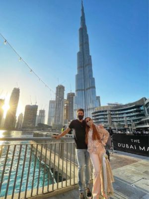 Após fazer mistério sobre o destino de sua nova viagem a dois, Maiara e Fernando Zor compartilharam os primeiros registros de suas férias em Dubai. A cantora sertaneja "anunciou" a chegada aos Emirados Árabes Unidos com uma foto romântica em frente ao Burj Khalifa. Com quase 1 quilômetro de altura, o cartão-postal é considerado o prédio mais alto do mundo desde 2010. "Chegamos Dubai!", comemorou Maiara na manhã de hoje, em seu Instagram. Em seus stories do Instagram, Fernando também falou sobre a chegada a Dubai e ainda detalhou que ele e Maiara estão hospedados na casa de amigos no emirado, que virou um destino popular entre famosos durante a pandemia de covid-19. O casal de sertanejos vinha fazendo mistério sobre a viagem desde terça-feira (26), quando mostraram o embarque no aeroporto de Guarulhos, em São Paulo, tomando espumante em uma sala de espera vip. Ele respondeu algumas apostas de seguidores sobre onde seriam as férias, com muitos apostando nos Estados Unidos, país descartado por Fernando.